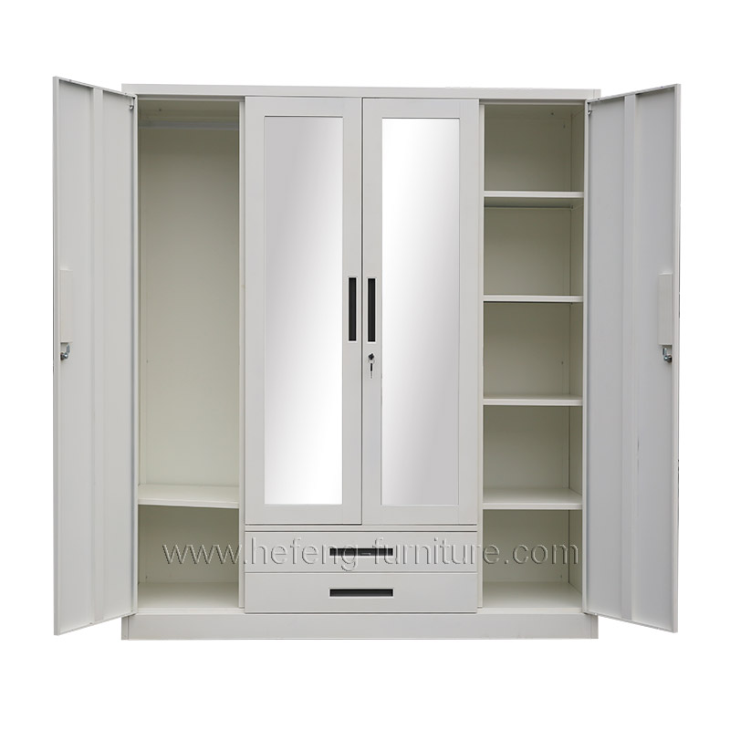 Fittings 1 shelf and 1 cloth hanging rod in left compartment, 2 swing door and 2 drawers in the middle part, 4 shelves in right compartment.